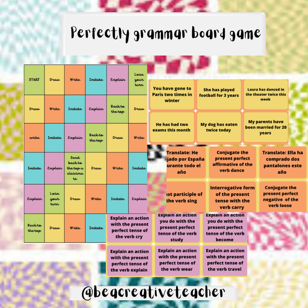 Hola hola!! Os traigo un juego de mesa con distintas categorías para practicar el present perfect: imitate, write, explain y draw. Se trataría de tirar un dado e ir pasando por las distintas categorías. Cuando lleguemos a una categoría de imitar, cogeremos la carta de ese color y nos tocará hacer mímica de esa situación y los compañeros tendrán que darnos la frase-situación que estamos imitando. Si nos toca la categoría write, nos tocará conjugar un verbo en presente perfecto o traducir una frase de español-inglés en presente perfecto. Al escoger la categoría explain, tendremos que explicar con palabras sin decir ninguna de las que componen la frase que tenemos que explicar y los demás la tendrán que averiguar (tipo tabú) y por último en la categoría draw, tendrán que dibujar la situación.